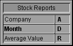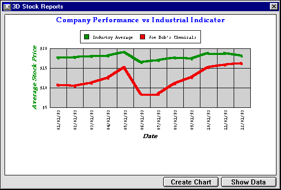 Imagine que usted quiere comparar el rendimiento de las acciones de su empresa con otras de la industria. Usted registra el valor de cierre diario de la acción de cada empresa en una base de datos 4D. En la base de ejemplo, los valores de las acciones se guardan como promedios mensuales.