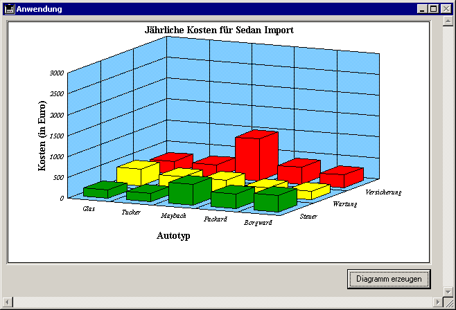 Dieses Diagramm wurde mit der Methode DIAGRAMM AUTOKOSTEN erstellt. Sie verwendet die Funktion CT Chart selection. Mit dieser Funktion übergeben Sie ein Array von Feldern. Die Namen der Felder werden die Namen der Reihen, ihre Werte werden auf der Werteachse gezeichnet. In diesem Beispiel wurden die Felder Steuer, Versicherung und Wartung für die Reihen und Werte verwendet.