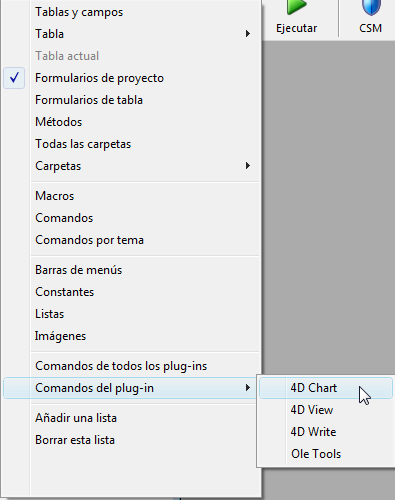 Los comandos 4D Chart pueden mostrarse en una lista en el editor de métodos de 4D. La lista puede contener sólo los comandos de 4D Chart, o todos los comandos de plug-ins disponibles:
