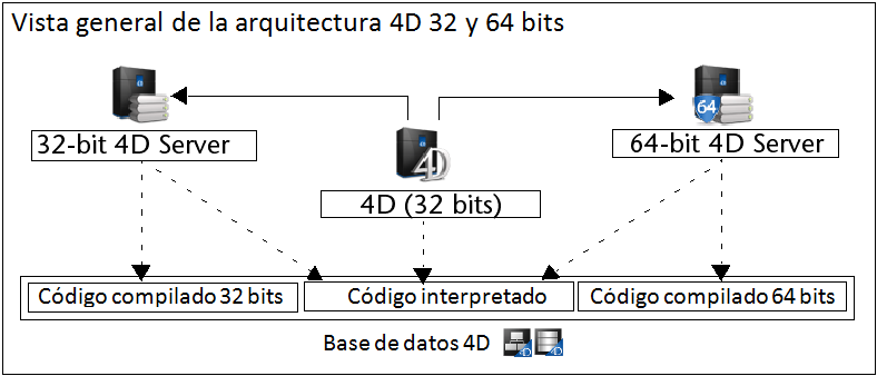 En modo interpretado, las mismas bases de datos 4D se pueden ejecutar con un 4D Server 64 bits o un 4D Server 32 bits. El desarrollo es idéntico independientemente de la aplicación utilizada.