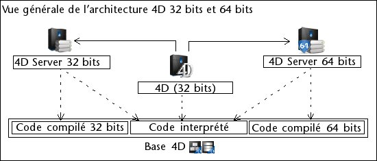 En mode compilé, les bases doivent avoir été compilées pour les processeurs 64 bits pour pouvoir être exécutées avec 4D Server 64 bits (cf. paragraphe "Compilation 64 bits"). Une base compilée en 32 bits uniquement et ne contenant pas le code interprété ne peut pas être exécutée avec 4D Server 64 bits.