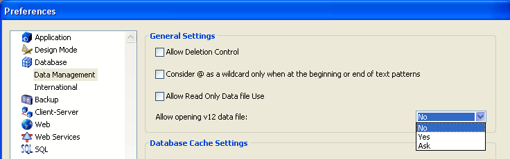 Entretanto, esses arquivos convertidos ainda poderão ser abertos na versão 11 se isso for explicitamente autorizado na versão 11. Isso é possível usando a preferência Permitir abertura de arquivo v12 na página "Banco de dados/Gestão de dados" em Preferências (somente a partir do 4D v11 SQL r6):