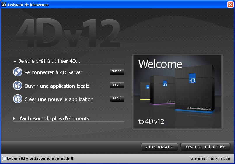Cet assistant est principalement destiné à guider les nouveaux utilisateurs de 4D au démarrage du programme. Il donne accès à toutes les actions possibles, qu’elles soient relatives à l’utilisation ou à l’activation de l’application.