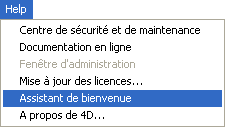 Par défaut, l’assistant est affiché à chaque démarrage. Vous pouvez le masquer en cochant l’option Ne plus afficher ce dialogue au lancement de 4D. Vous pourrez à tout moment l’afficher de nouveau en sélectionnant la commande Assistant de bienvenue dans le menu Aide :