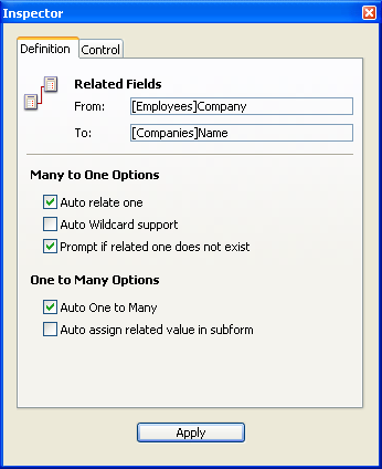 SET FIELD RELATION([Empregados]Empresa;2;0) `muda a relação Muitos a Um a manual