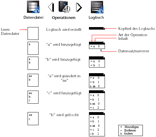 4D verwaltet das Logbuch. Es schreibt alle Operationen mit, die die Datendatei betreffen, egal welche Aktion vom Benutzer, in 4D Methoden, der SQL Engine, 4D Plug-Ins (4D Write, 4D View, etc.) oder einem Web Browser ausgeführt werden.