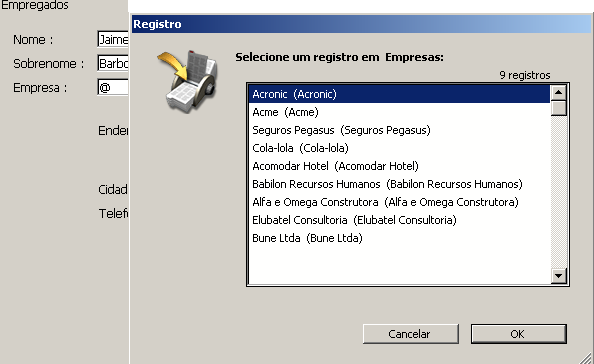 Campo discriminante A lista de campos discriminantes permite selecionar um campo adicional para mostrar na lista de valores (que aparece quando usuário escreve o caractere curinga (@) no campo relacionado durante a entrada de dados). Geralmente, é melhor selecionar o campo que melhor identifique ao registro. Assim é como funciona esta opção durante a entrada de dados: 4D permite ao usuário consultar os valores da tabela Um enquanto introduz dados no campo chave estrangeira na tabela Muitos. O usuário simplesmente usa o caractere curinga (@) padrão no campo relacionado. Ao fazê-lo, 4D busca a entrada correspondente na tabela Um relacionada. O caractere curinga pode ser utilizado de duas formas: para completar uma entrada parcial ou para mostrar a lista de valores válidos. Quando se mostra uma lista, o usuário pode selecionar o valor da lista. Um campo adicional, o campo discriminante, pode ser mostrado junto ao campo relacionado. Por exemplo, imagine que o usuário está criado um registro na tabela [Empregados]. Em vez de escrever Acme no campo Empresa, o usuário pode escrever Ac@ e logo pressionar a tecla Tab para passar ao próximo campo. Como @ é o caractere curinga de 4D, esta entrada significa que “o valor começa por “Ac” e está seguido por outros caracteres”. 4D busca na tabela relacionada o registro que corresponda a este critério. Se só encontra um registro, completa a entrada automaticamente e passa o próximo campo na ordem de entrada do formulário. A imagem a seguir mostra este tipo de uso dos caracteres curinga. Se 4D encontra mais de um valor que corresponda ao critério, mostra uma lista de valores para que o usuário possa selecionar o valor apropriado. A imagem a seguir mostra a lista: É possível especificar um segundo campo que será mostrada na lista para ajudar ao usuário a decidir que empresa selecionar. O segundo campo é o campo discriminante que você selecionou na caixa de diálogo de definição do tipo de relação. A imagem a seguir mostra a lista de empresas junto com sua cidade. Este campo discriminante ajuda ao usuário a selecionar a entrada correta se não se lembra o nome da empresa, mas se lembra a cidade em que está localizada. Para ver uma listagem completa de todas as empresas na tabela [Empresas], o usuário digita apenas @. 4D exibe uma lista de todas as companhias para que o usuário escolha a correta. A figura abaixo mostra uma lista de companhias sendo exibida: A janela de seleção de registros pode ser redimensionadas. Para ver uma lista de todas as empresas na tabela [Empresas], o usuário deve escrever @ unicamente. 4D mostra uma lista de todas as empresas para que o usuário selecione a correta.