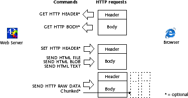 Combinado com o novo comando GET HTTP BODY e com os outros comandos do tema “Servidor web”, este comando completa o conjunto de ferramentas disponíveis para os desenvolvedores 4D para tratar de maneira completamente personalizada as conexões HTTP entrantes e saintes. Estas ferramentas são apresentadas no diagrama abaixo: