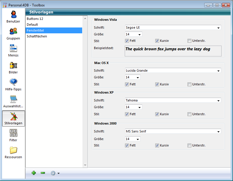 Die Reihenfolge der Anzeige richtet sich nach dem aktuellen Betriebssystem von 4D: Läuft 4D z.B. auf Windows Vista, erscheint oben auf der Seite der Windows Vista Bereich mit dem Beispieltext.