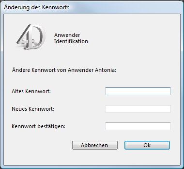 Um das Kennwort zu ändern, muss der Benutzer zuerst das alte Kennwort eingeben. Dann gibt er das neue Kennwort einmal ein und noch einmal zum Bestätigen. Klickt er auf die Schaltfläche OK, wird bei korrekter Eingabe das alte Kennwort durch das neue ersetzt und in der Datenbank gespeichert. Der Benutzer muss sich dann mit dem neuen Kennwort anmelden, um die Datenbank zu öffnen.