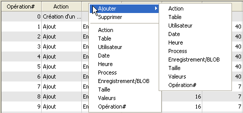 Chaque opération élémentaire enregistrée dans le fichier d’historique apparaît sous forme d’une ligne. Les colonnes fournissent diverses informations concernant l’opération. Vous pouvez modifier l’affichage par défaut des colonnes — et notamment afficher les valeurs de champs — à l’aide du menu contextuel de la fenêtre (cf. ci-dessous). En outre, la date et l’heure d’ouverture et de fermeture du fichier de données sont également affichées.