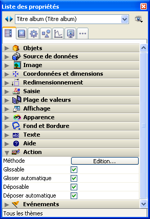 Voici la Liste des propriétés, dans laquelle les propriétés "Glissable" et "Déposable" ont été définies pour l'objet sélectionné :