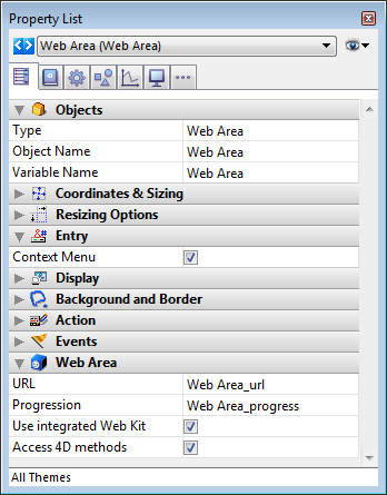 Várias ações padrão,numerosos comandos de linguagem e eventos de formulário permitem ao desenvolvedor controlar o funcionamento das áreas web. As variáveis específicas permitem trocar informação entre a área e o ambiente 4D.
