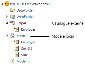 Lorsque la connexion est établie avec succès, les tables 4D "exposées" sont ajoutées aux classes du modèle côté Wakanda. Dans Wakanda Enterprise Studio, elles apparaissent parmi les classes du modèle local, identifiées par une petite flèche rouge. Le catalogue externe est également représenté dans Wakanda Studio par un catalogue spécifique (nommé nomLocal.waRemoteCatalog) signalé par une petite flèche rouge :