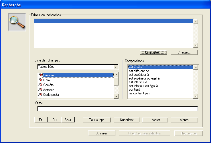 L’éditeur de recherches ne s'affiche pas. Au lieu de cela, la recherche est définie et effectuée par la commande CHERCHER. L’utilisateur n’a rien à faire.