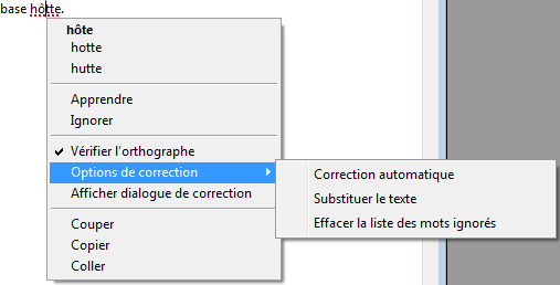 Pour afficher les options de correction, il suffit de cliquer avec le bouton droit de la souris sur un mot inconnu. Le menu contextuel qui apparaît contient les commandes du correcteur :