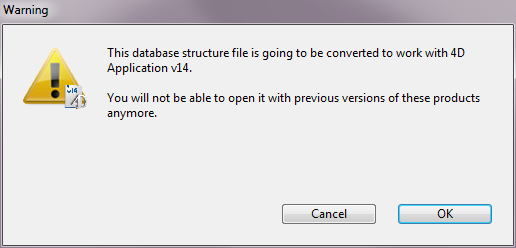 A conversão de uma base em versão 13 se realiza diretamente ao abrir ele com 4D v14. Aparecerá uma caixa de diálogo de alerta que indica que o arquivo de estrutura vai ser convertido, e que já não pode ser aberto com uma versão anterior.