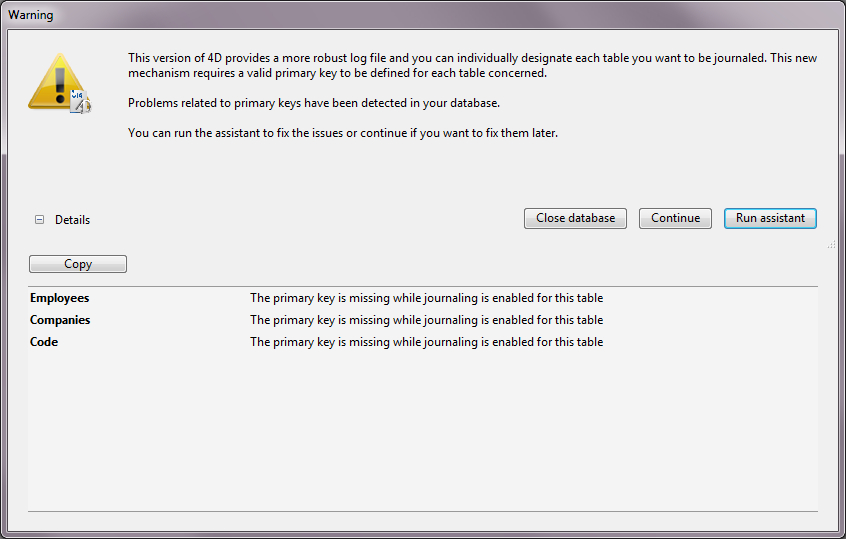 Nota: se o histórico não está ativado na base, a caixa de diálogo de erro lhe oferece a opção de abrir a base apesar do erro de chave primária.