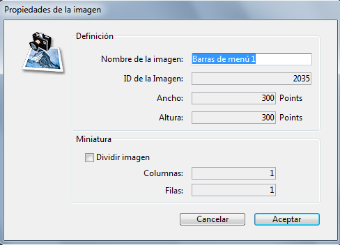 Puede crear una secuencia de miniaturas de una imagen que se encuentre en la librería de imágenes o en el momento de añadir una imagen a la librería de imágenes. En ambos casos, usted define cómo va a ser dividida la imagen en la caja de diálogo Propiedades de la imagen. Si está creando una imagen, la caja de diálogo aparece automáticamente. De lo contrario, haga doble clic en la imagen o selecciónela y elija Propiedades de la imagen en el menú opciones de la librería.