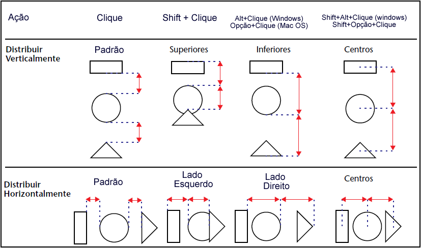 Por padrão, se define um intervalo constante  baseado nas esquinas dos objetos selecionados. Também pode distribuir objetos com banco en suas partes superiores, inferiores, centros, como se vê no seguinte diagrama: