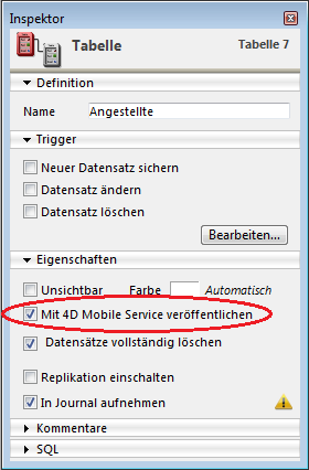 Zeigen Sie im Struktureditor den Inspektor für Tabellen an und wählen die gewünschte Tabelle aus. Standardmäßig ist die Option Mit 4D Mobile Service veröffentlichen markiert