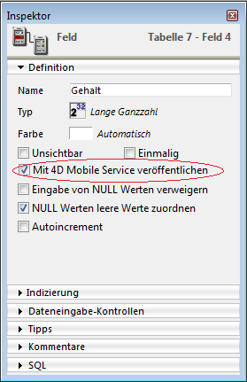 Zeigen Sie im Struktureditor den Inspektor für Felder an und wählen das gewünschte Feld aus. Standardmäßig ist die Option Mit 4D Mobile Service veröffentlichen markiert