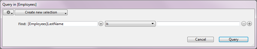 Escreva o valor que quer buscar. Em um campo Alfa ou Texto, pode utilizar o caractere coringa (@) ao final do valor para solicitar uma pesquisa de tipo “começa por”. Se o campo selecionado está associado a uma lista, 4D mostra a lista para que selecione um valor. Se o campo que selecionou é booleano, 4D mostra um par de botões de opção.
