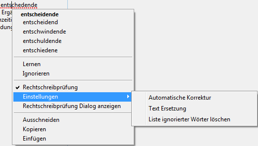 Der Benutzer kann dann den Text über das Kontextmenü (rechter Mausklick auf das unterstrichene Wort) oder über das Dialogfenster Rechtschreibprüfung verbessern.