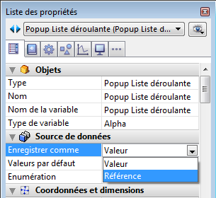 L'option Enregistrer comme Valeur/Référence est disponible dans le thème "Sources de données" pour les objets de type Champs et variables objets ainsi que les Pop-ups/Listes déroulantes :