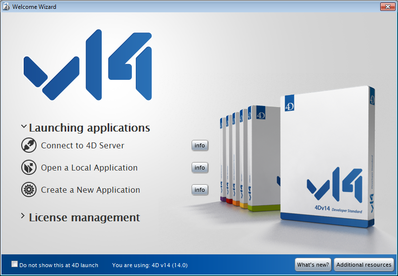 Esse assistente está destinado principalmente a guiar os novos usuários de 4D assim que o programa inicia. Dá acesso a todas as ações possíveis relativas ao uso e/ou ativação da aplicação.