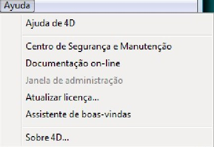 Por padrão, o assistente é exibido cada vez que se inicia 4D. Você pode ocultá-lo selecionando a opção Não exibir essa janela ao iniciar. Você pode fazer com que essa mensagem apareça novamente a qualquer momento selecionando o comando Assistente de boas-vindas no menu Ajuda: