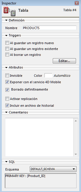 Las propiedades de los objetos del editor de estructura (tablas, campos y relaciones) pueden visualizarse y modificarse vía la paleta del Inspector: