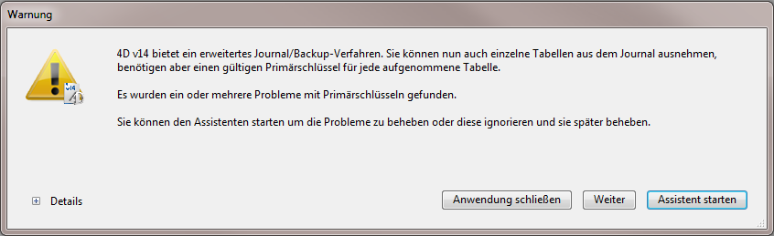 In 4D v14 müssen alle Tabellen, die im Logbuch protokolliert werden, einen gültigen Primärschlüssel haben (siehe Logbuch verwalten). Deshalb erscheint ein Fehlerdialog, wenn mindestens eine Tabelle in der 4D Anwendung keinen gültigen Primärschlüssel hat.