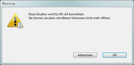 Eine Anwendung in Version 13 wird direkt konvertiert, wenn Sie diese mit 4D v14 öffnen. Eine Warnung informiert Sie, dass die Strukturdatei konvertiert wird und sich dann nicht mehr mit einer früheren Version öffnen lässt: