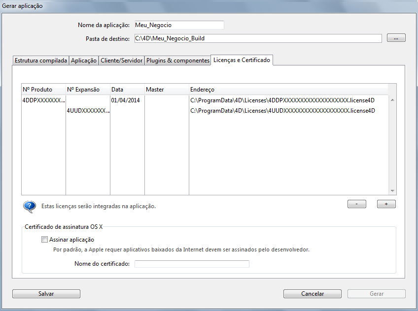 A página Licenças mostra a lista das licenças de distribuição disponíveis que pode integrar sua aplicação. Por padrão, a lista está vazia. Deve adicionar explícitamente sua licença 4D Developer Professional assim como cada licença 4D Desktop Volume a utilizar na aplicação gerada. Pode adicionar outro número 4D Developer Professional e suas licenças associadas diferentes das que estão sendo atualizadas atualmente.