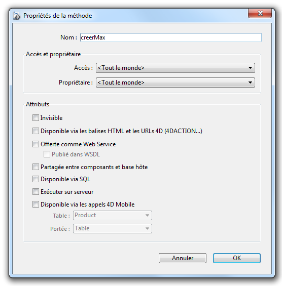 La boîte de dialogue “Propriétés de la méthode” apparaît. Elle vous permet de modifier le nom ainsi que d’autres propriétés de la méthode.