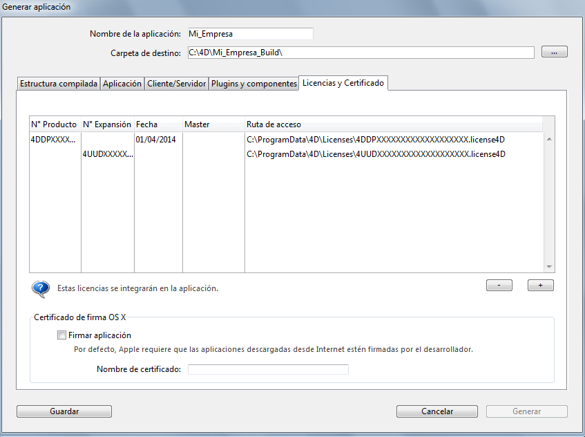 Una vez generada la aplicación, se incluye automáticamente un nuevo archivo de licencia de despliegue en la carpeta Licenses junto a la aplicación ejecutable (Windows) o en el paquete (Mac OS).