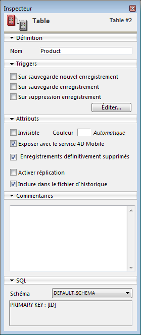 Toutes les propriétés des objets de l’éditeur de structure (tables, champs et liens) peuvent être visualisées et modifiées via la palette de l’Inspecteur :