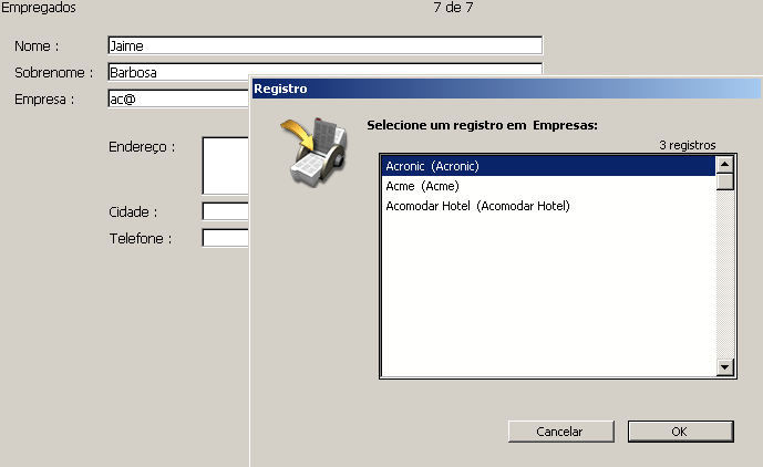 Campo discriminante A lista de campos discriminantes permite selecionar um campo adicional para mostrar na lista de valores (que aparece quando usuário escreve o caractere curinga (@) no campo relacionado durante a entrada de dados). Geralmente, é melhor selecionar o campo que melhor identifique ao registro. Assim é como funciona esta opção durante a entrada de dados: 4D permite ao usuário consultar os valores da tabela Um enquanto introduz dados no campo chave estrangeira na tabela Muitos. O usuário simplesmente usa o caractere curinga (@) padrão no campo relacionado. Ao fazê-lo, 4D busca a entrada correspondente na tabela Um relacionada. O caractere curinga pode ser utilizado de duas formas: para completar uma entrada parcial ou para mostrar a lista de valores válidos. Quando se mostra uma lista, o usuário pode selecionar o valor da lista. Um campo adicional, o campo discriminante, pode ser mostrado junto ao campo relacionado. Por exemplo, imagine que o usuário está criado um registro na tabela [Empregados]. Em vez de escrever Acme no campo Empresa, o usuário pode escrever Ac@ e logo pressionar a tecla Tab para passar ao próximo campo. Como @ é o caractere curinga de 4D, esta entrada significa que “o valor começa por “Ac” e está seguido por outros caracteres”. 4D busca na tabela relacionada o registro que corresponda a este critério. Se só encontra um registro, completa a entrada automaticamente e passa o próximo campo na ordem de entrada do formulário. A imagem a seguir mostra este tipo de uso dos caracteres curinga. Se 4D encontra mais de um valor que corresponda ao critério, mostra uma lista de valores para que o usuário possa selecionar o valor apropriado. A imagem a seguir mostra a lista: É possível especificar um segundo campo que será mostrada na lista para ajudar ao usuário a decidir que empresa selecionar. O segundo campo é o campo discriminante que você selecionou na caixa de diálogo de definição do tipo de relação. A imagem a seguir mostra a lista de empresas junto com sua cidade. Este campo discriminante ajuda ao usuário a selecionar a entrada correta se não se lembra o nome da empresa, mas se lembra a cidade em que está localizada. Para ver uma listagem completa de todas as empresas na tabela [Empresas], o usuário digita apenas @. 4D exibe uma lista de todas as companhias para que o usuário escolha a correta. A figura abaixo mostra uma lista de companhias sendo exibida: A janela de seleção de registros pode ser redimensionadas. Para ver uma lista de todas as empresas na tabela [Empresas], o usuário deve escrever @ unicamente. 4D mostra uma lista de todas as empresas para que o usuário selecione a correta.