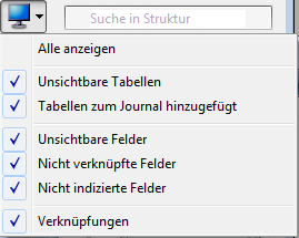 Standardmäßig werden alle Objekte angezeigt. Diese Funktionalität ermöglicht verschiedene Darstellungen und Ebenen — von der einfachsten bis zur komplexesten — und bietet gleichzeitig ein Werkzeug zum Analysieren der Struktur je nach gewünschter Informationsebene. Eine Auswahl gilt für alle Tabellen und Felder. Die jeweilige Einstellung wird pro Benutzer gesichert und beim Schließen des Fensters abgespeichert. Das Ausblenden bestimmter Objekte verändert nicht die Position der Tabellen.