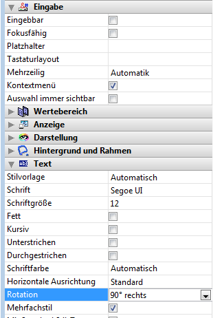 Wählen Sie für ein Objekt vom Typ Feld oder Variable in der Eigenschaftenliste im DropDown-Menü "Rotation" eine Option (außer 0°), werden die Eigenschaften Eingebbar und Fokusfähig für dieses Objekt automatisch deaktiviert (falls erforderlich):