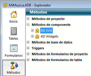 Si el componente está instalado correctamente, el elemento de 4D SVG aparece en la página Métodos de la base, en la sección "Métodos de componente":