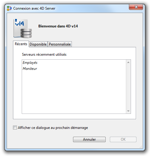 Si vous cochez l'option Afficher ce dialogue au prochain démarrage, cette boîte de dialogue sera automatiquement affichée au démarrage de l'application 4D.