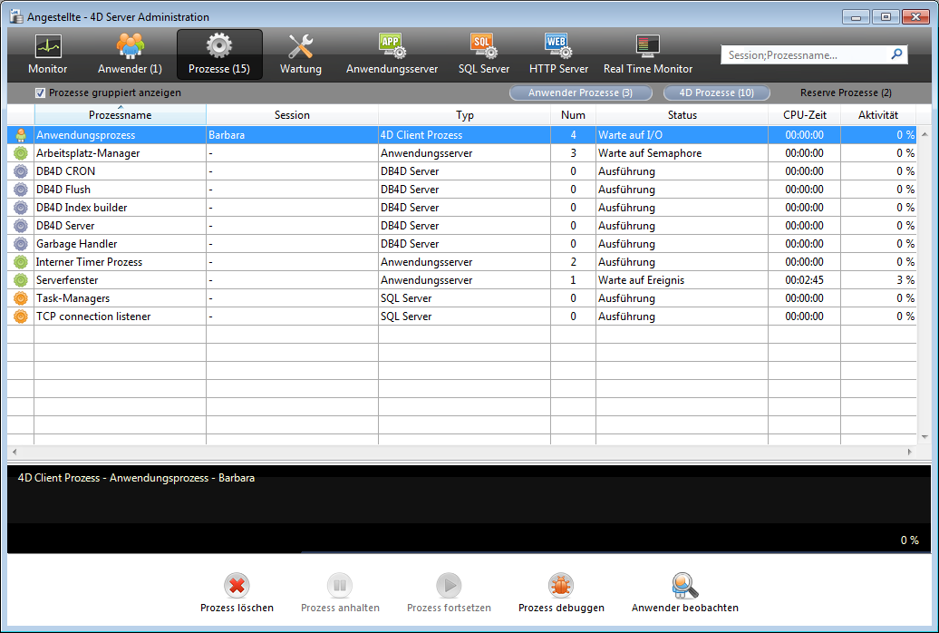 Die ersten Prozesse betreffen den Server, sie wurden beim Starten von 4D Server eingerichtet. Die neuen Prozesse betreffen den ersten Benutzer, der sich am Server angemeldet hat: