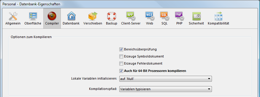 Anwendungen in 4D v12 lassen sich für 32-bit und 64-bit Prozessoren kompilieren. Dazu verwenden Sie in den Datenbank-Eigenschaften auf der Seite "Compiler" die neue Option Auch für 64-bit Prozessoren kompilieren: