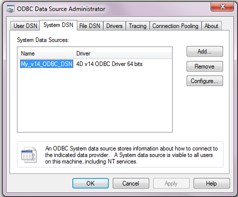 If you intend to completely remove a 4D ODBC Driver, you must first remove all the Data Source Names created for this driver. This can be done from the ODBC Data Source Administrator: