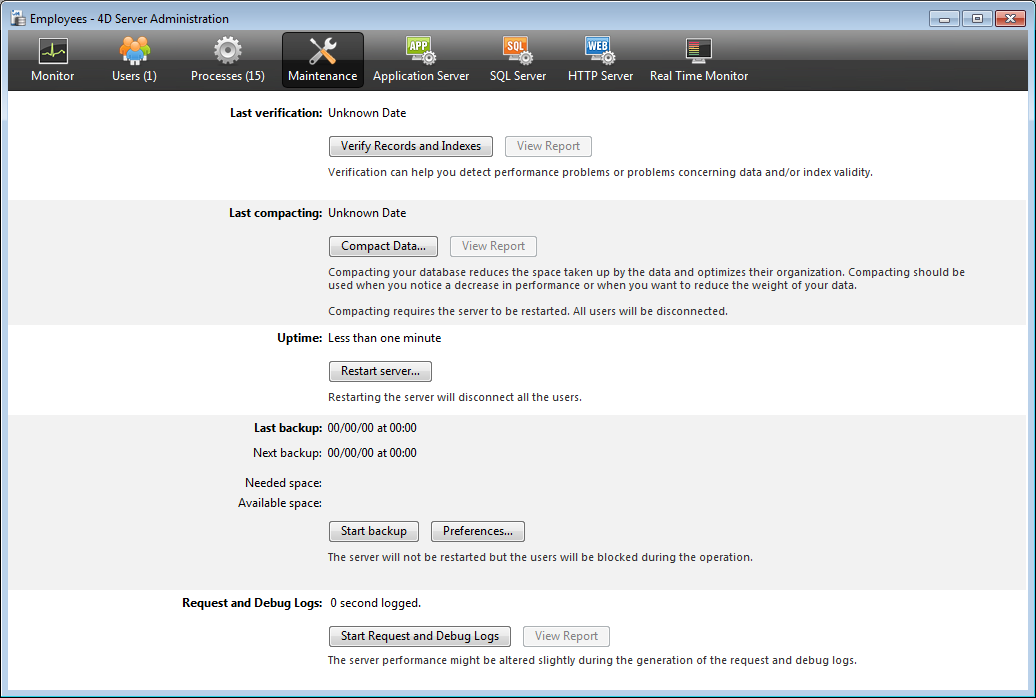 Después de la interrupción de la base, 4D Server efectúa una compactación estándar de los datos de la base. Si quiere opciones adicionales, necesitará el Centro de seguridad y de mantenimiento (CSM).