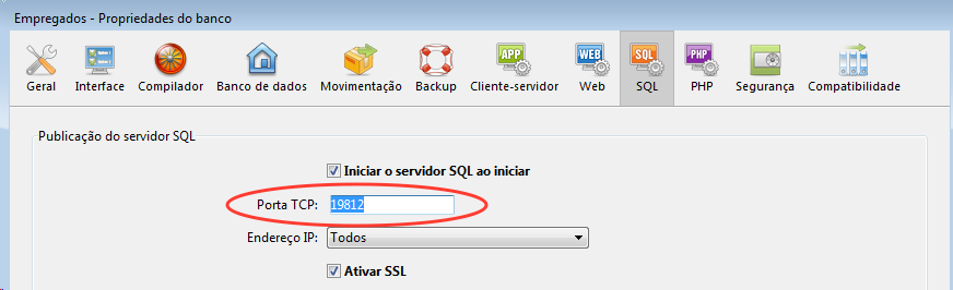 Port Especifica a porta de conexão. Valor por padrão: 19812 Este porta deveser o mesmo queo que se proporcionana páginaSQL/Página de configuração dasPropriedades da base(na equipe servidor).