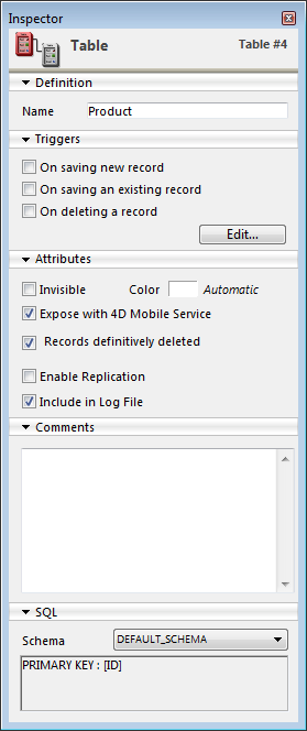 Las propiedades de los objetos del editor de estructura (tablas, campos y relaciones) pueden visualizarse y modificarse vía la paleta del Inspector: