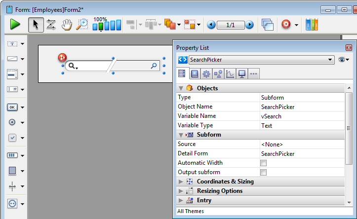 Subform | ![]() | Adds a subform area which can be used to display a form from another database or a project form shared by a component. |